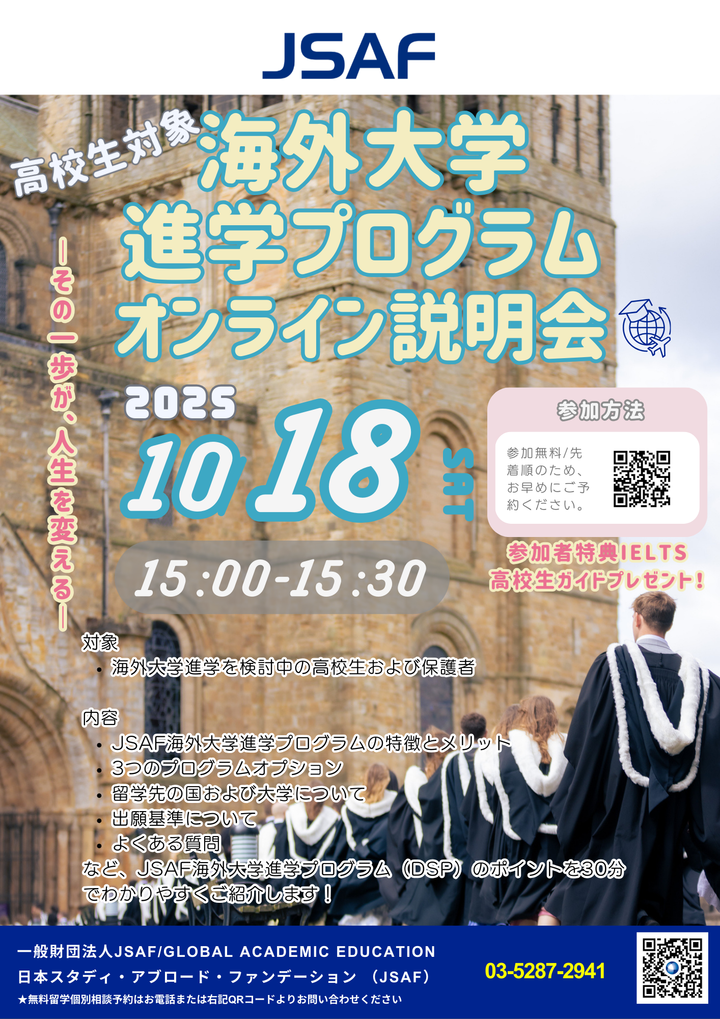 HOME10/18(土)海外大学進学イベント(オンライン)10/18(土)海外大学進学イベント(オンライン) JSAF留学セミナー・情報セッションSEMINAR SESSION カテゴリーメニュー 留学説明会・イベント JSAF留学セミナー・情報セッション一覧 関西圏対象JSAF個別相談 学校別JSAF留学・学内説明会情報 メニュー アクセス スタッフ採用情報 プライバシーポリシー 利用規約 免責事項 10/18(土)海外大学進学イベント(オンライン)開催日時:終了しました10月18日(土)JSAF海外大学進学についての総合情報イベントを開催いたします。オンライン実施で、参加無料です。事前予約が必要です。(先着100名まで)